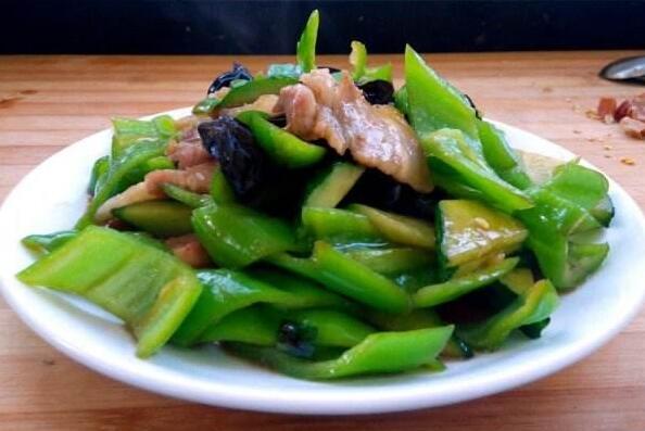 9、放入尖椒,继续翻炒,放入少许盐,糖,鸡精勾芡即可出锅。