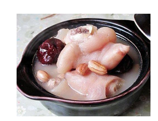 花生能增强记忆,抗老化,延缓脑功能衰退,滋润皮肤。花生还有扶正补虚、悦脾和胃、润肺化痰、滋养调气、利水消肿、止血生乳、清咽止疟的作用。猪蹄是美容佳品,里面的胶原蛋白,是滋养肌肤的最佳来源。此道汤煲可养血声精、滋养肌肤,是秋冬季节女人的滋补汤。