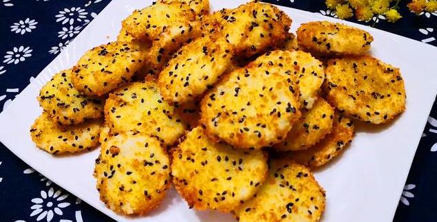 然后捞出山药片控干水分,让其表面微湿即可,放到淀粉中滚上一层干淀粉,做这一步的目的是为了一会儿挂蛋液的时候不滑脱,山药如果直接挂蛋液,因其表面有一层滑滑的粘液,再遇上滑滑的鸡蛋液,是很难溶合到一起的,所以我们要先滚上一层淀粉,然后再把它放到打散的蛋液中,均匀地挂上一层蛋液,再放到面包糠中,均匀地蘸上一层面包糠。