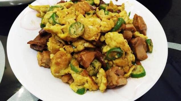 食材:3个鸡蛋、2根青杭椒、3小片豆干、盐、生抽、鸡精、油
