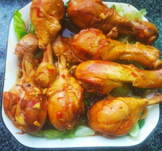 第九部:把煮熟的鸡腿均匀地摆在生菜上面,把汤汁也浇在生菜上面,一道美味的鸡腿做好了。