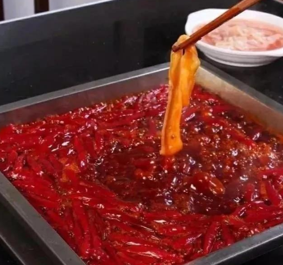 锅下炼熟的菜籽油30千克,烧至150℃时放入干辣椒碎7.5千克熬制半小时,然后放入大葱段、老姜块各2.5千克,香料碎(草果、白蔻、桂皮、沙姜、小茴香、甘草、砂仁、当归各70克,提前用水喷一下至湿润),继续小火熬制1小时,停火过滤去掉渣子,即成麻辣艳红的火锅油。
