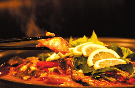 此时,店里隐约传来一阵调动人味蕾的酸辣香味。寻香望去,服务员端着泰式酸辣烤鱼过来了。黄澄澄的柠檬片、绿油油的西芹叶、红彤彤的小米辣,为烤鱼增添丰富的色彩。鱼肉的香气混杂着酸涩的柠檬清香,空气中似乎都蒙上一层调皮的清新气息。“很多年轻人喜欢吃泰式火锅,而泰式酸辣味烤鱼在整个重庆很少,我就试着研发,调整味道,前后花了近一个月的时间。”廖志文告诉笔者。