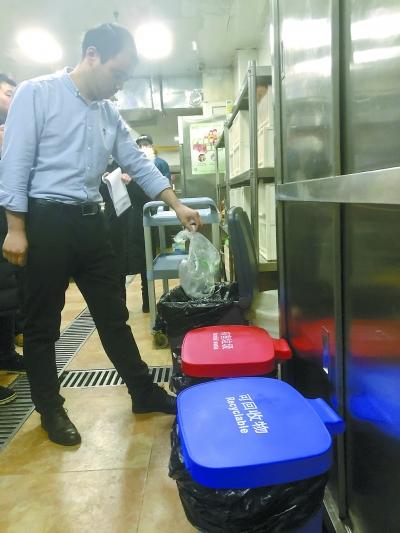 一家西餐馆的后厨内,分类垃圾桶齐备。