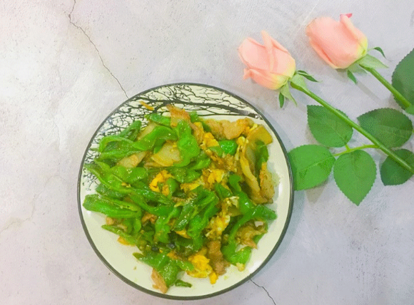 第七步,待辣椒煸炒到微微变软时,加入提前炒好的肉片、荷包蛋块,翻炒均匀后,加入少许盐、1勺蒸鱼豉油,翻炒均匀后出锅装盘即可。