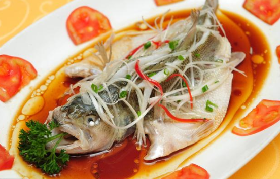 7、8分钟以后,鲈鱼就蒸熟了,挑去大葱和生姜,倒掉多余的水分,把调好的料汁均匀地浇在鲈鱼的身上,然后把切好的葱姜丝和辣椒丝放在鲈鱼上面。
