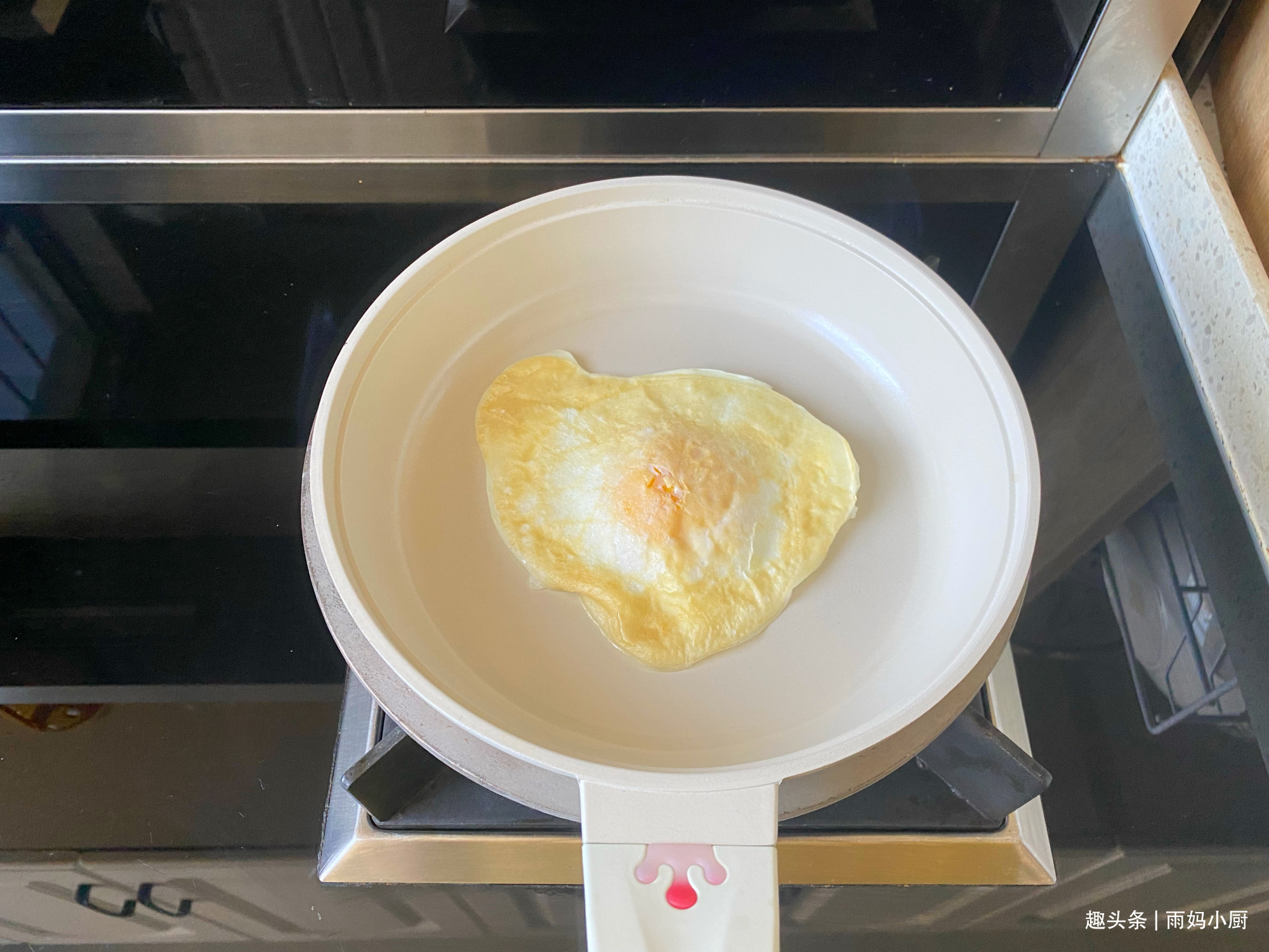8、烧水的时候,把平底锅烧热,无需放油,直接嗑入鸡蛋,做个煎蛋。