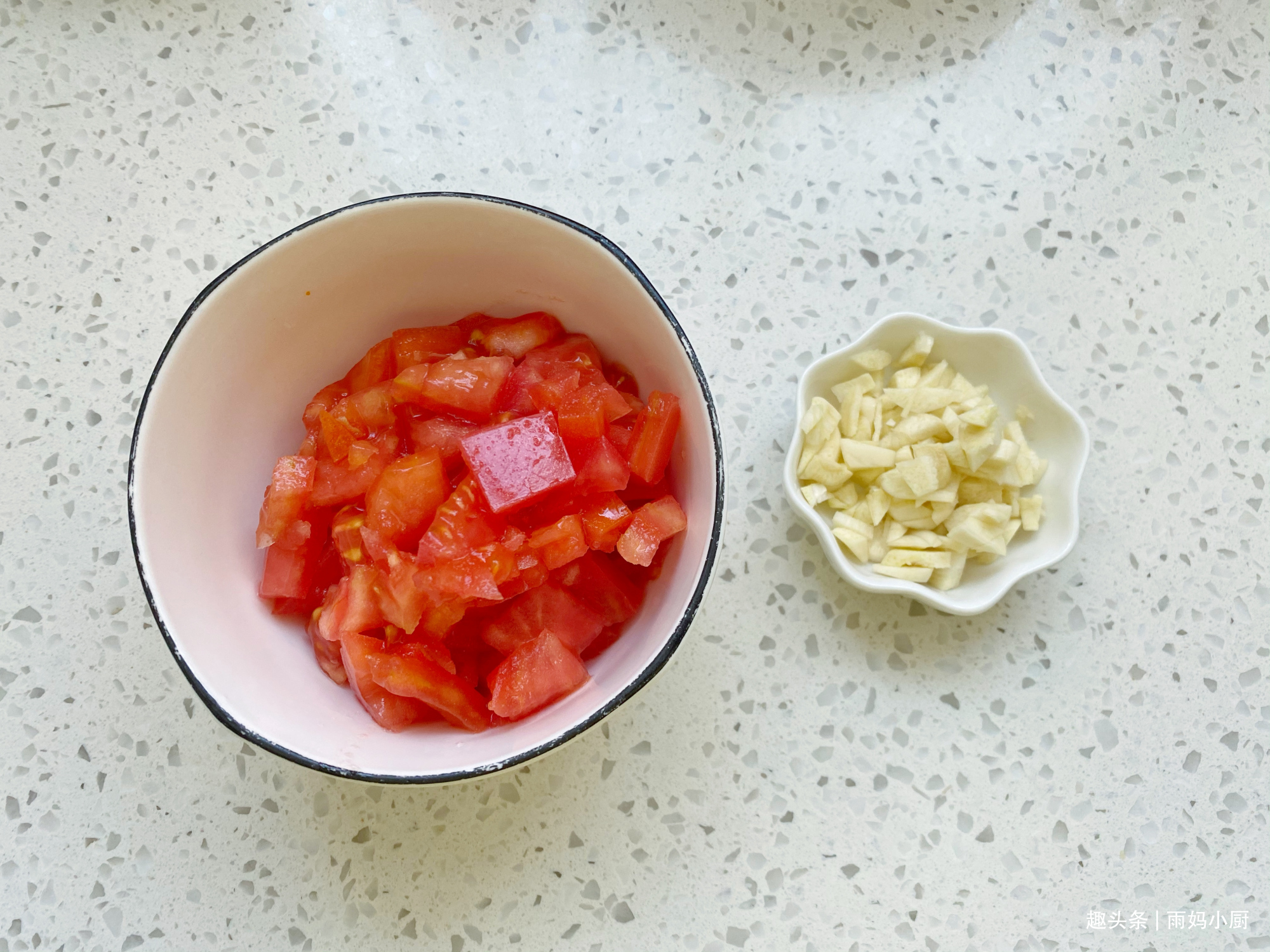 3、把西红柿切成小粒放入碗里,大蒜切成蒜粒装盘备用。