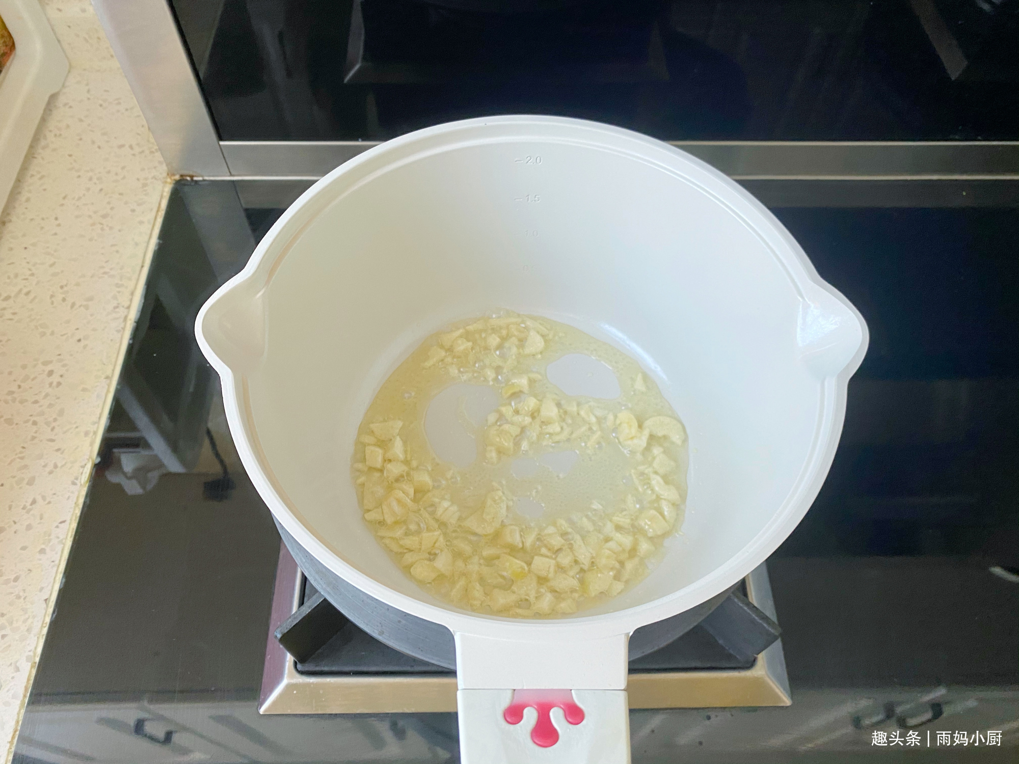 4、奶锅放入少许植物油,烧热后放入大蒜粒炒出香味。