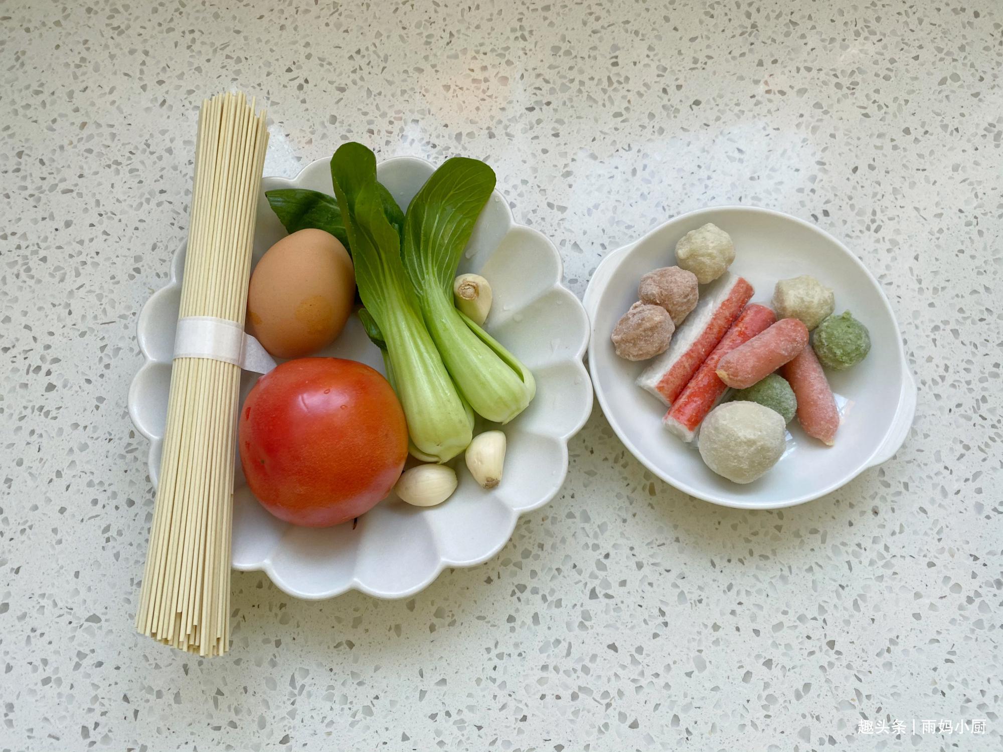 【食材】:面条100克,西红柿1个,油菜2棵,鸡蛋1个,大蒜3粒,火锅丸子适量,盐少许,清水适量