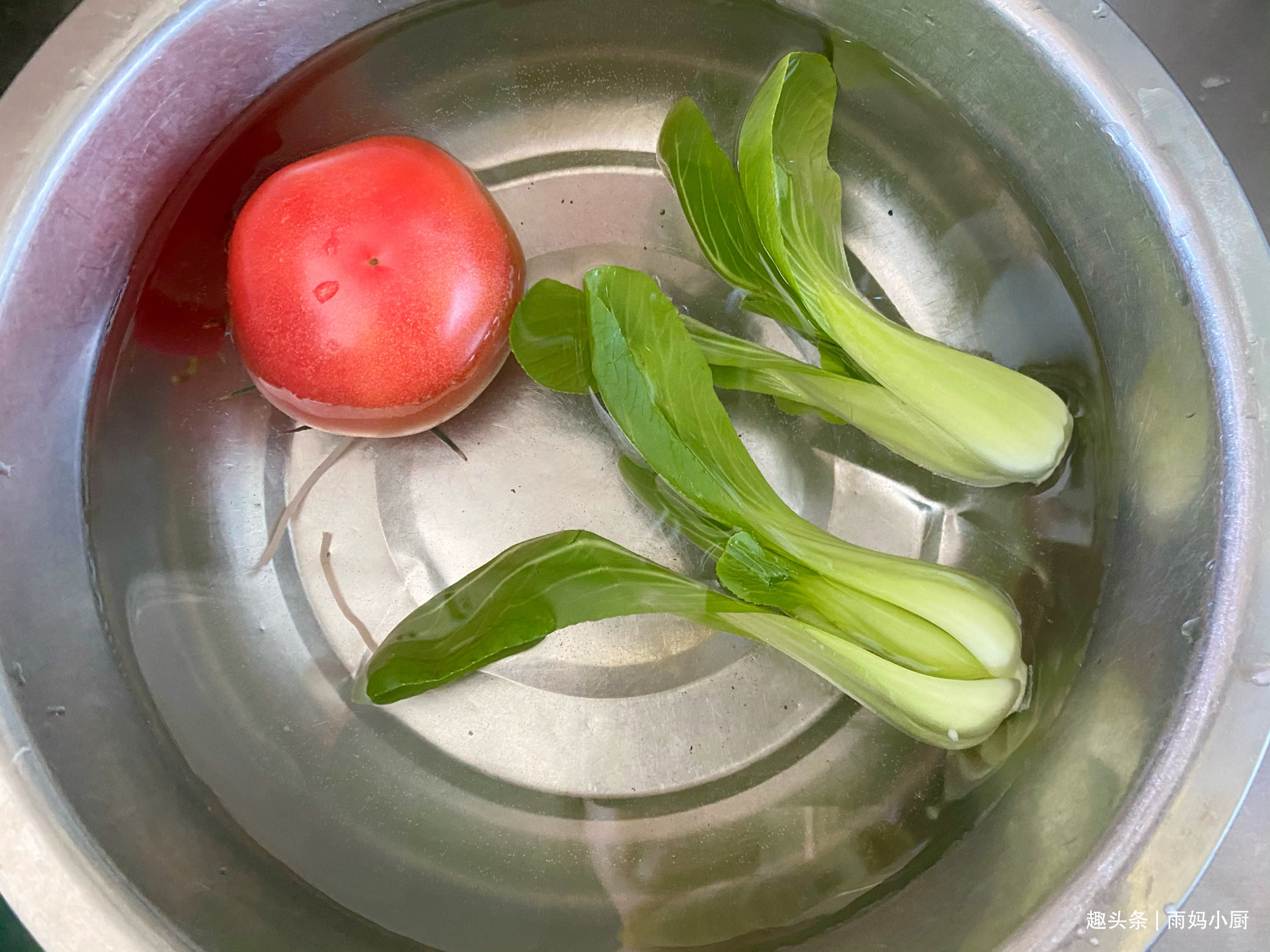 2、把油菜和西红柿放入淡盐水中,浸泡后清洗干净。