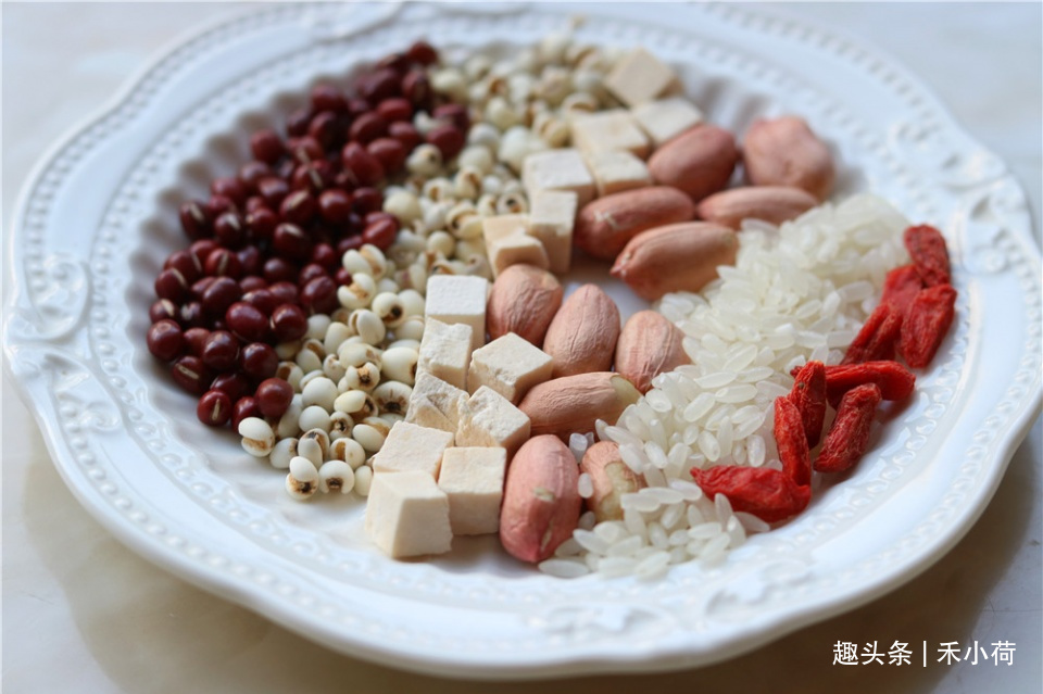 食材:红豆半杯,薏米半杯,大米1杯,花生20克,茯苓适量,冰糖适量,枸杞适量。