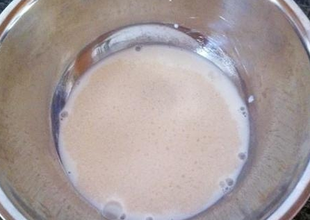 第二步,酵母粉放入在温热的配方奶中,将其混合搅拌好,静置一会,然后分次少许倒入在面粉中,将其搅拌好,用筷子搅拌成无干粉的状态;