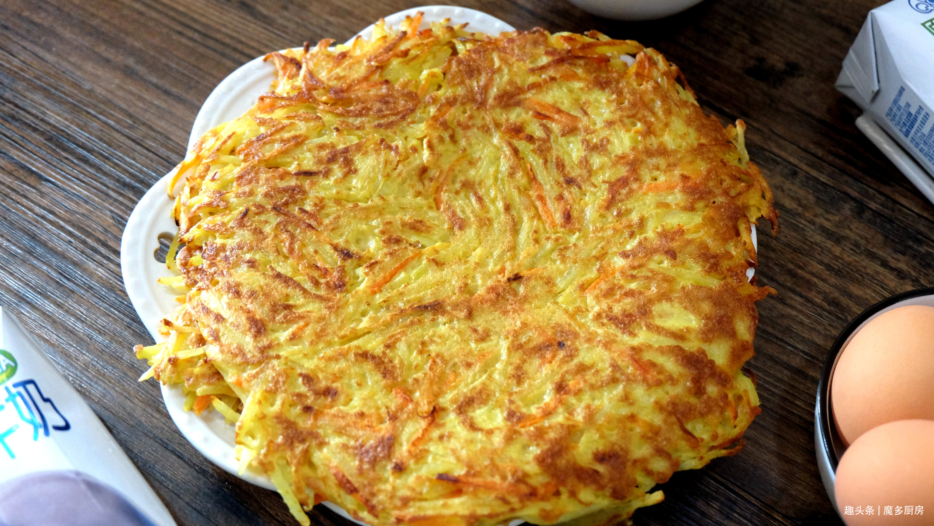 早餐主食除了玉米和紫薯以外,还准备了简单易做又好吃的土豆饼。把土豆、胡萝卜分别去皮擦丝,放进小盆里,再加两个鸡蛋、一点点全麦面粉、和一小勺盐搅拌均匀,平底锅烧热,放少许食用油,倒入一勺土豆糊,摊成薄饼,小火煎至两面熟透即可出锅。一共做了两张土豆饼,我和多爸一人一份,刚好。