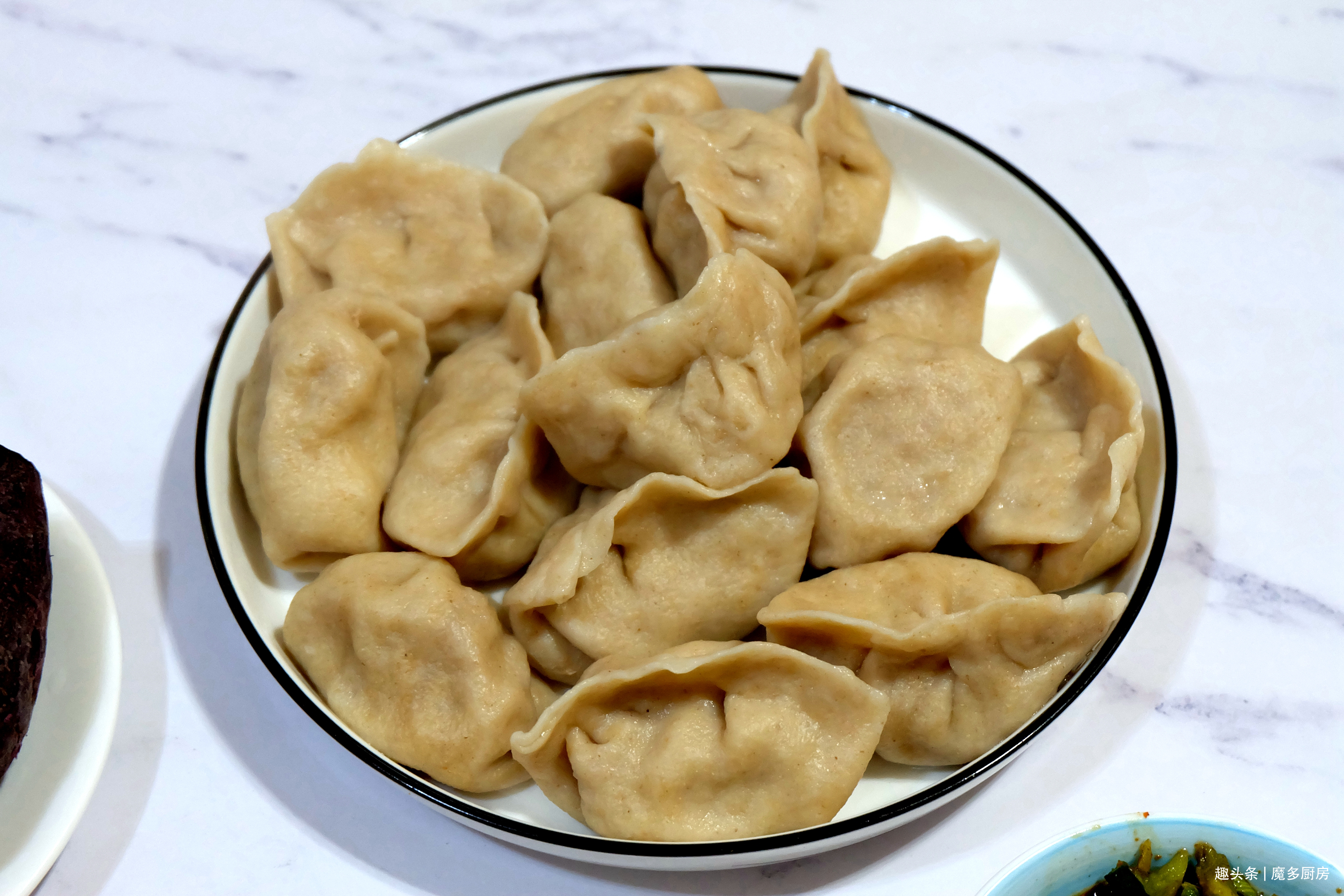 今天早餐的主食是我喜欢的饺子,猪肉白菜馅的。用全麦面粉加清水揉面做的饺子皮,颜色比较深,但这种全麦面粉营养更好,是住在农村的朋友用自家的麦子磨好的面粉寄给我的。