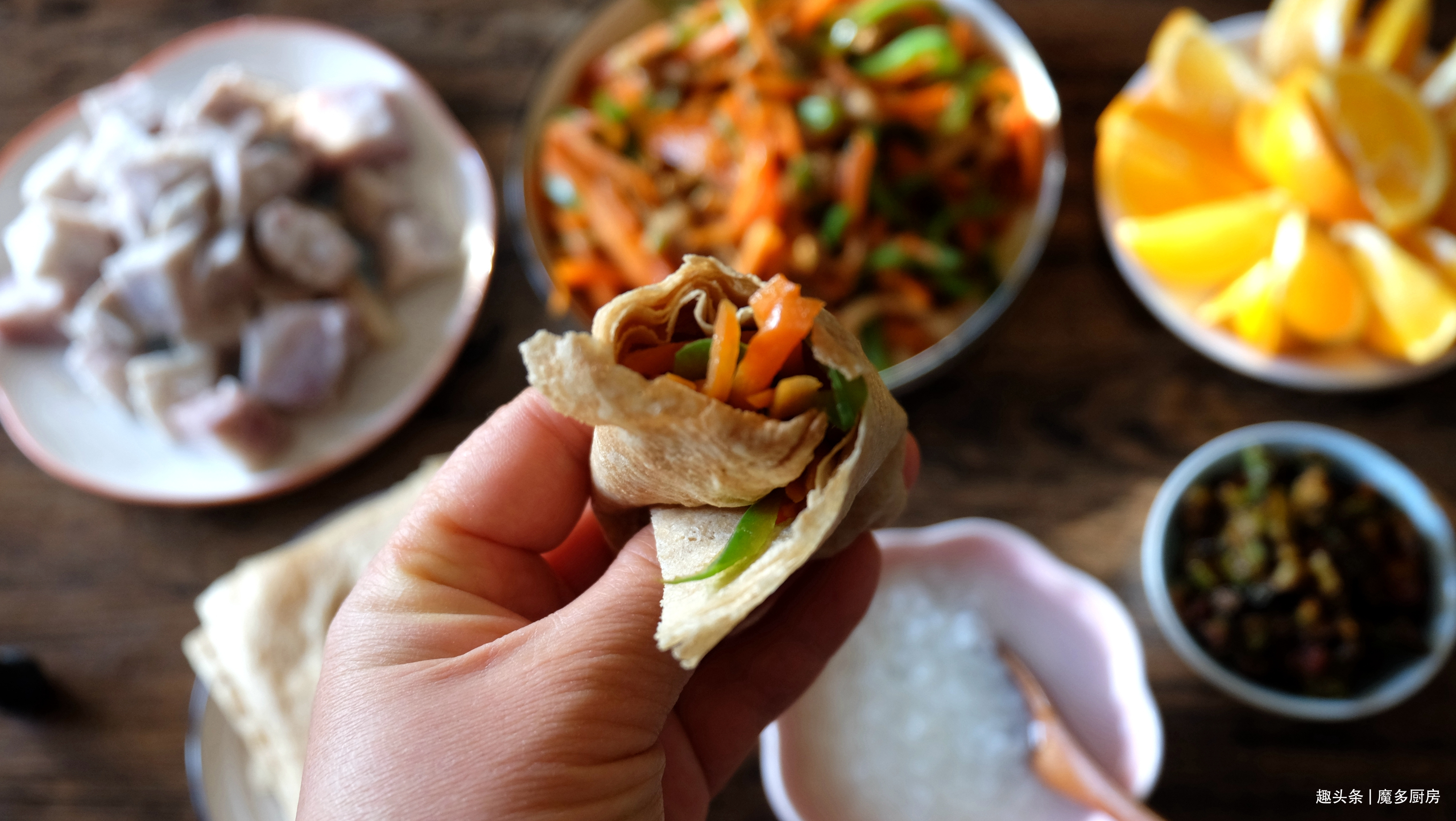 粗粮煎饼卷炒菜也是老家里常见的吃法,这种煎饼直接吃比较硬,有韧劲,所以要撕开,薄薄的一层,卷上热乎乎的炒菜,煎饼就变软了,咬起来不费劲,吃起来特别香。
