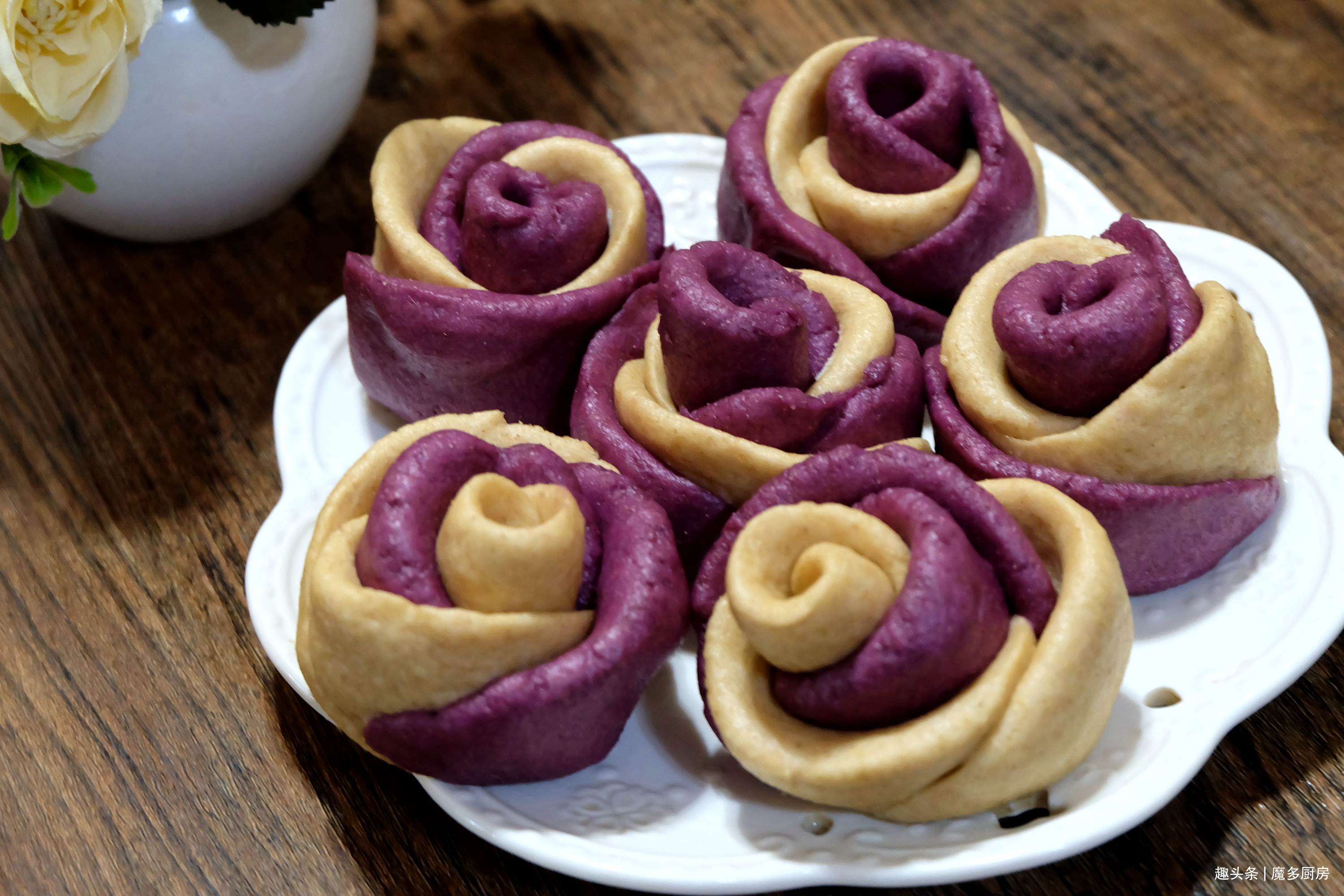 刚好剩了一个蒸熟的紫薯,剥去外皮,和130g全麦面粉、60g清水、1.5g酵母粉混合揉成一个紫色的面团。又用130g全麦面粉和70g清水、1.5g酵母粉揉了一个原色的面团。分别揉好以后搓长,切成15个小面剂,擀成圆开有饼皮,五个一组卷起来,每组可以做两朵玫瑰花形状的馒头生胚,一共做了6只,放进35度的蒸箱里发酵25-30分钟,发酵充分以后再蒸熟,好看又好吃的双色玫瑰花馒头就做好了。