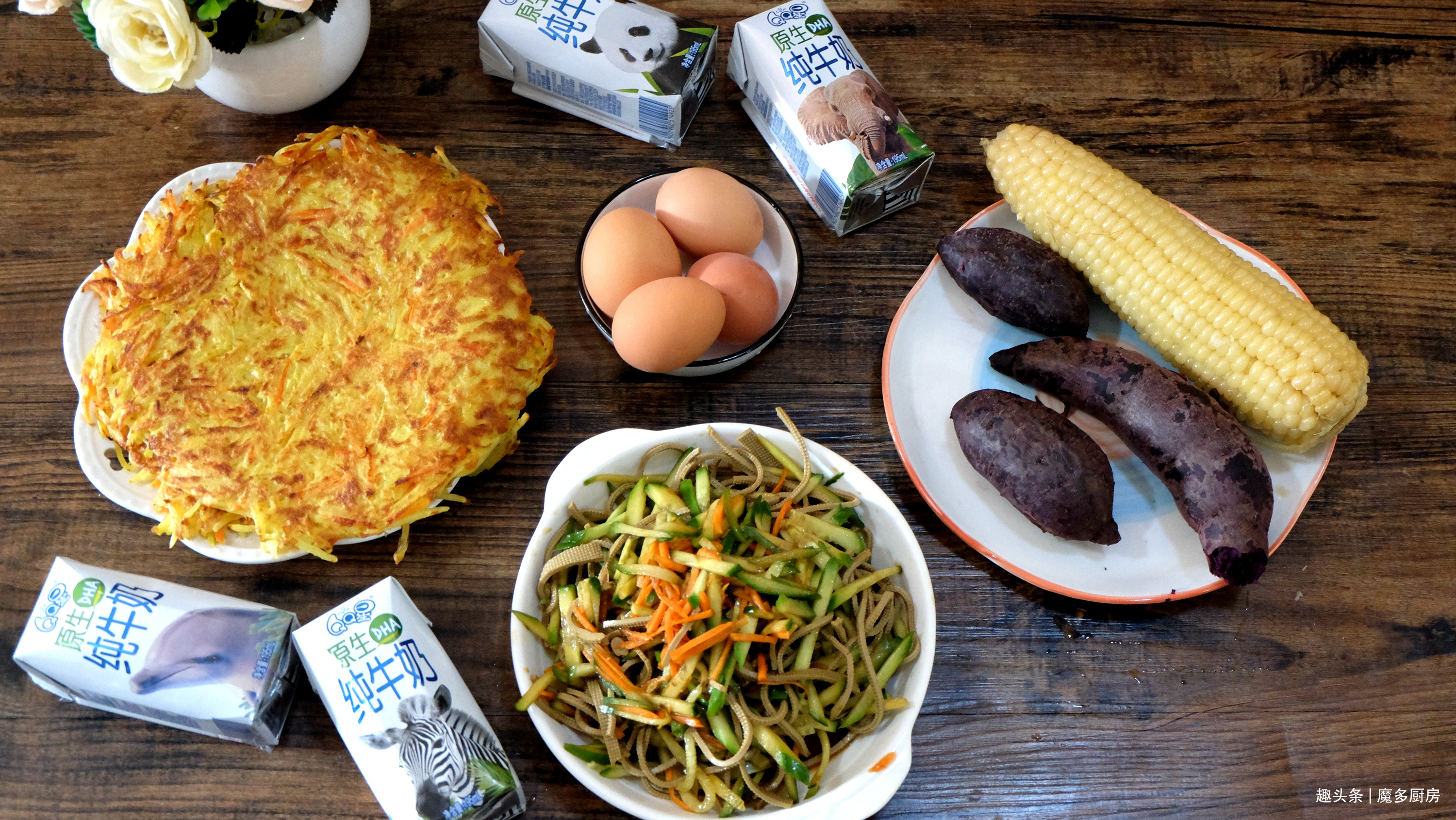 第三天:牛奶、土豆饼、黄瓜拌豆腐丝、蒸紫薯、蒸玉米、煮鸡蛋。