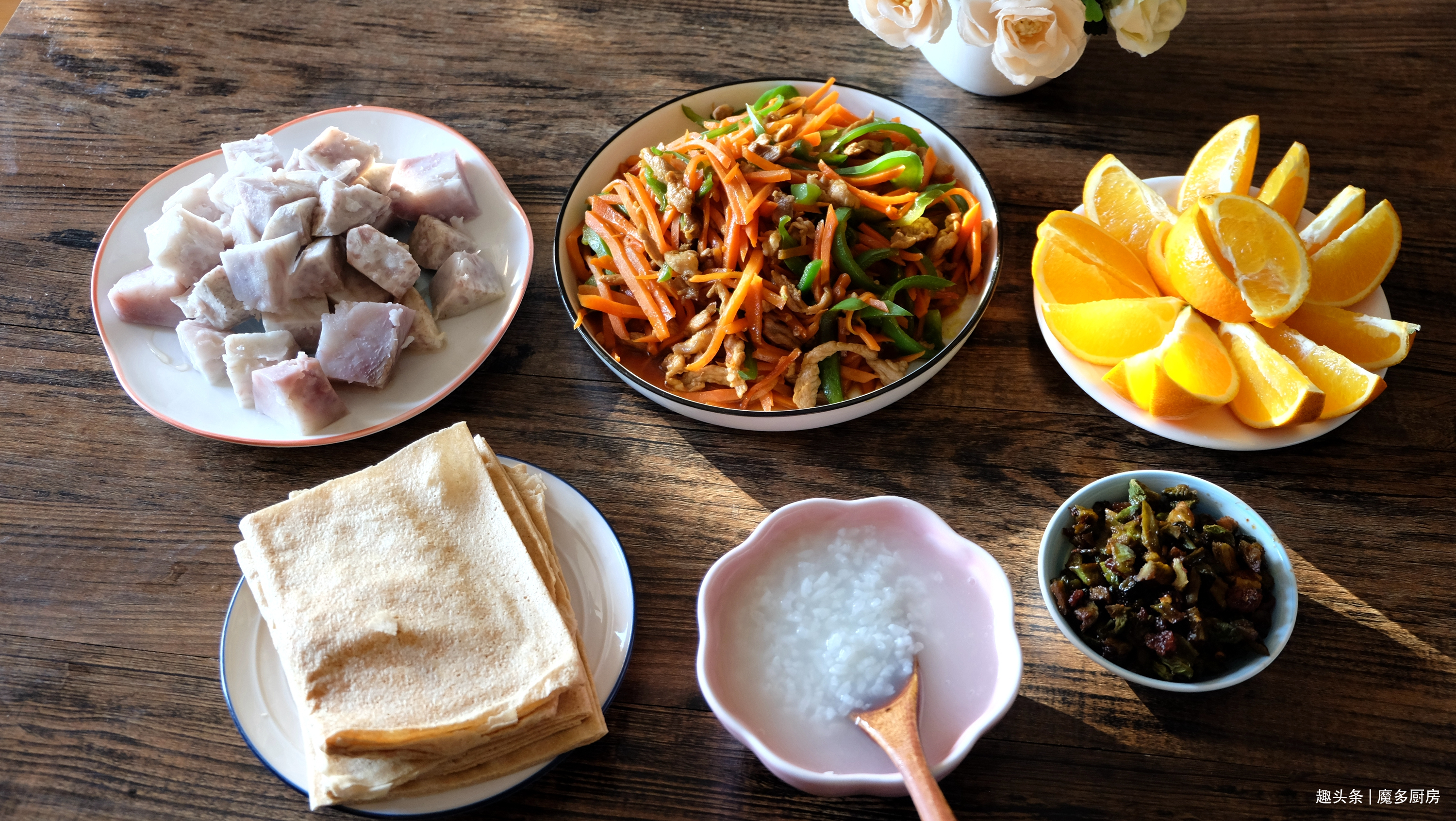第一天:米粥、青椒胡萝卜炒肉丝、煎饼、萝卜干、茶叶鹌鹑蛋、橙子、蒸芋头。