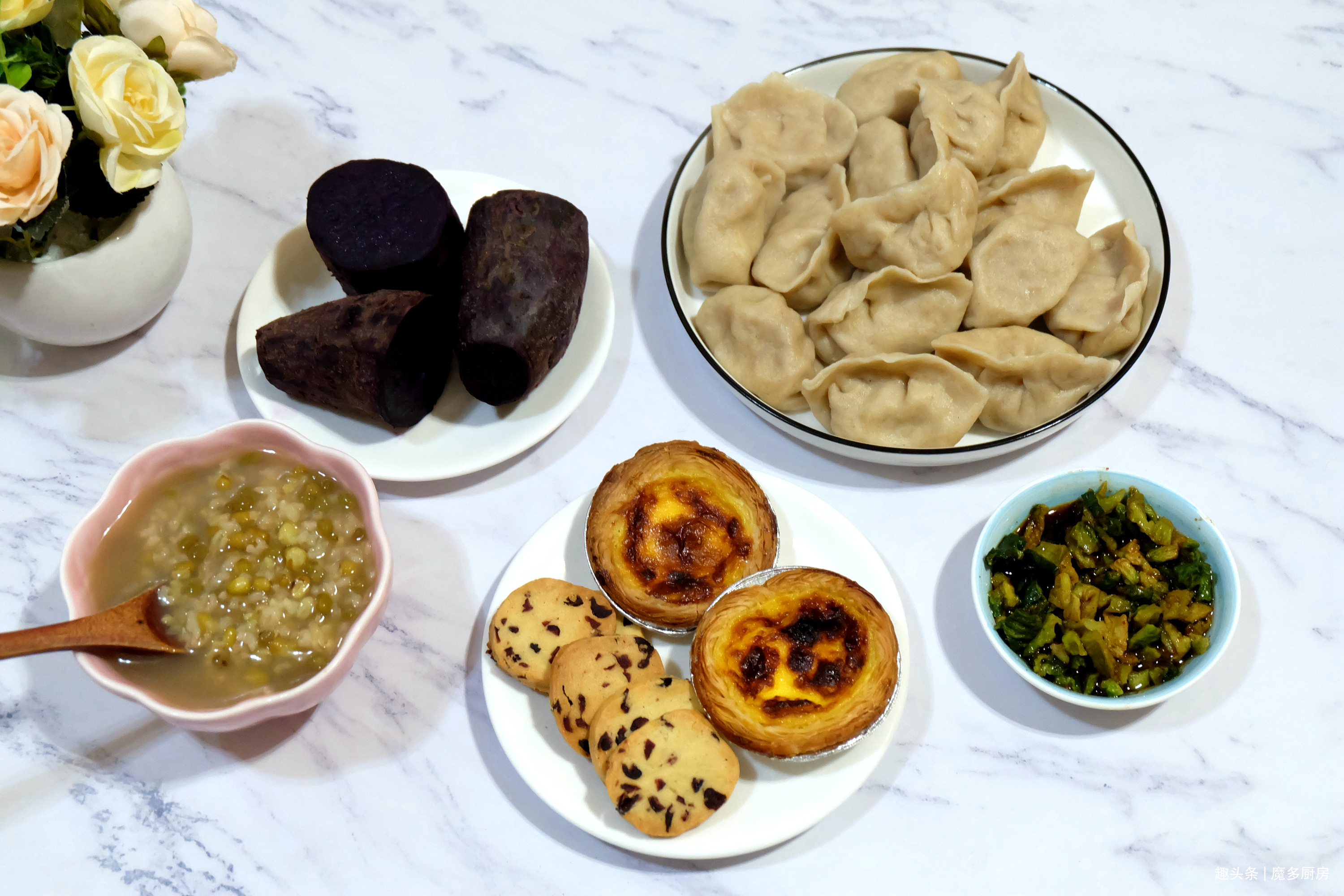 第五天:绿豆大米粥、猪肉白菜饺子、萝卜干、蔓越莓饼干、蛋挞、蒸紫薯。