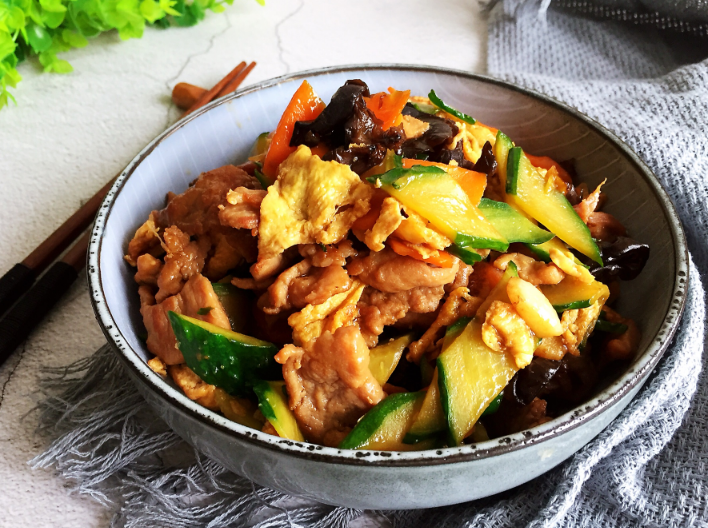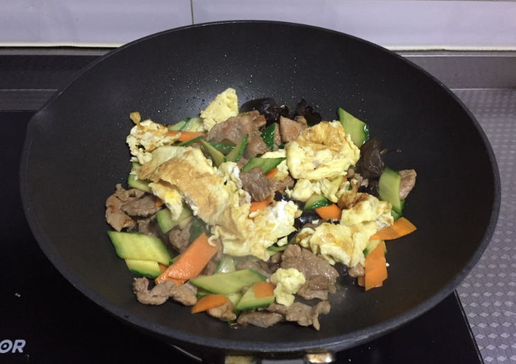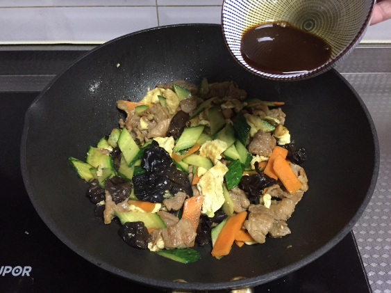 第五步、倒入木耳翻炒10秒钟,再倒入黄瓜、胡萝卜翻炒30秒,最后倒入炒好的鸡蛋块,淋入小碗里的料汁,快速翻炒均匀,即可关火出锅。木须肉就做好了。