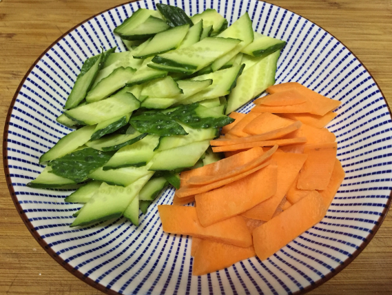 准备新鲜猪肉、黄瓜、胡萝卜、木耳、鸡蛋、葱姜蒜、食盐、生抽、香醋、白糖、食用油等。