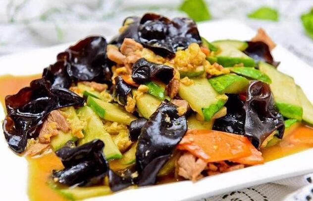 第三步:准备好煎锅,往锅里倒适量食用油。锅里的油热了后,我们把准备好的蛋液倒进锅里。等到锅里的蛋液凝固后,我们迅速把蛋液炸成小块。待鸡蛋略黄后,就可以熄火了,然后将鸡蛋放入锅中放入碗中备用。接着,我们先把锅清洗干净,等锅加热,再往锅里加些食用油,等锅里的油加热,然后把猪里脊肉倒进锅里,用大火把猪里脊肉炒一下变色,然后把它从锅里拿出来放在碗里备用,把锅里剩下的油加热,然后把切好的胡萝卜和黑木耳倒进锅里,炒一段时间后用大火翻过来,我们把切好的黄瓜放进锅里,继续炒1分钟左右。