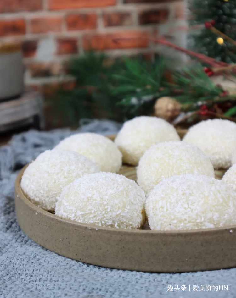 第六步:取一个小剂子按平,包上馅料收口捏紧,在椰蓉上滚一圈就可以啦!