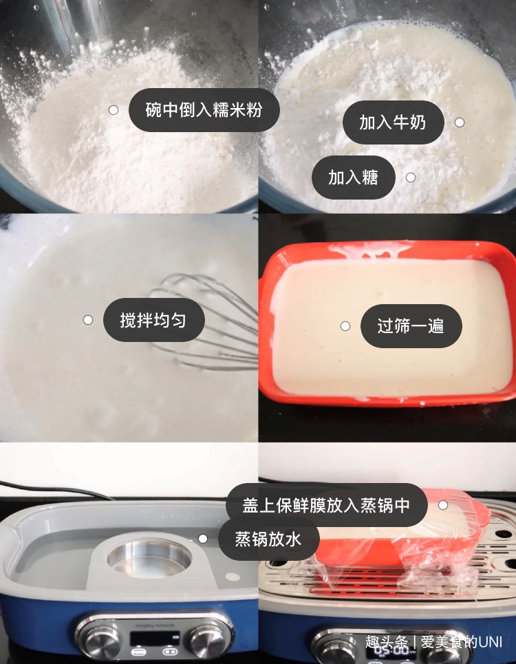 第一步:把糯米粉倒入盆中+玉米淀粉+牛奶+白糖搅拌均匀过筛一遍。