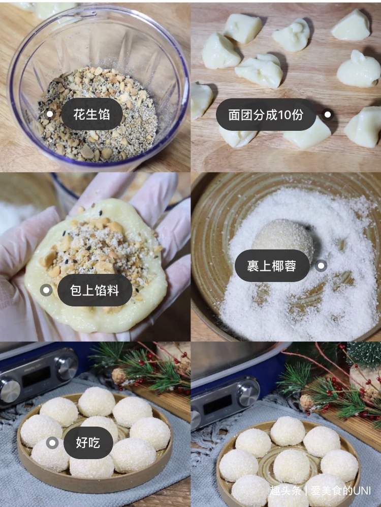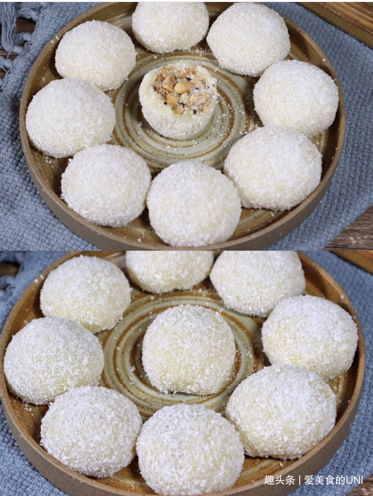 外皮软糯包裹着香脆可口的花生芝麻椰蓉馅。