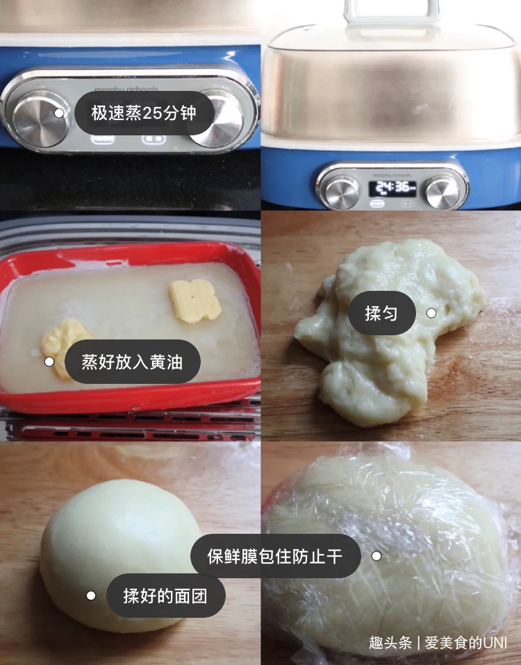 第五步:蒸好后放入黄油,放在案板上带上手套揉到不粘揉匀,揉好后均匀的分成10等份。