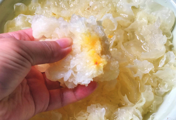 正宗的干银耳放在清水中,浸泡一段时间,将银耳充分泡胀,记住“充分”二字,而不是简单的把银耳泡软,要将银耳给泡胀,用手去捏银耳的时候,发现手上会留下黏性物质,这种效果才算充分泡胀,至少浸泡两个小时。