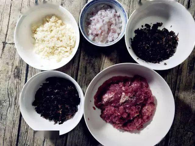 马蹄去皮切碎,土鱿去掉表面那层膜切丁,木耳,云耳泡发后,木耳剁碎,云耳切片(不要切碎),脢头肉剁碎备用。(不要剁成泥,这样会导致肉质失去口感)