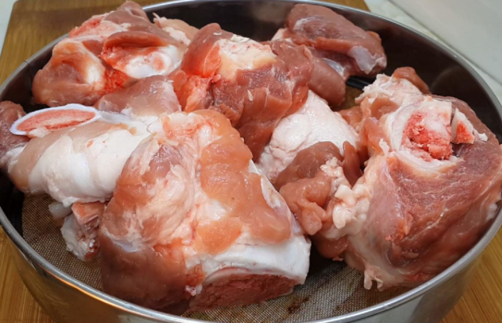 清洗的时候建议用有一点点温度的水,因为大骨头上有油脂,用冷水洗,很难清洗干净,用温水更方便,不过水温要调节好,不要太热了,避免将肉质烫熟。