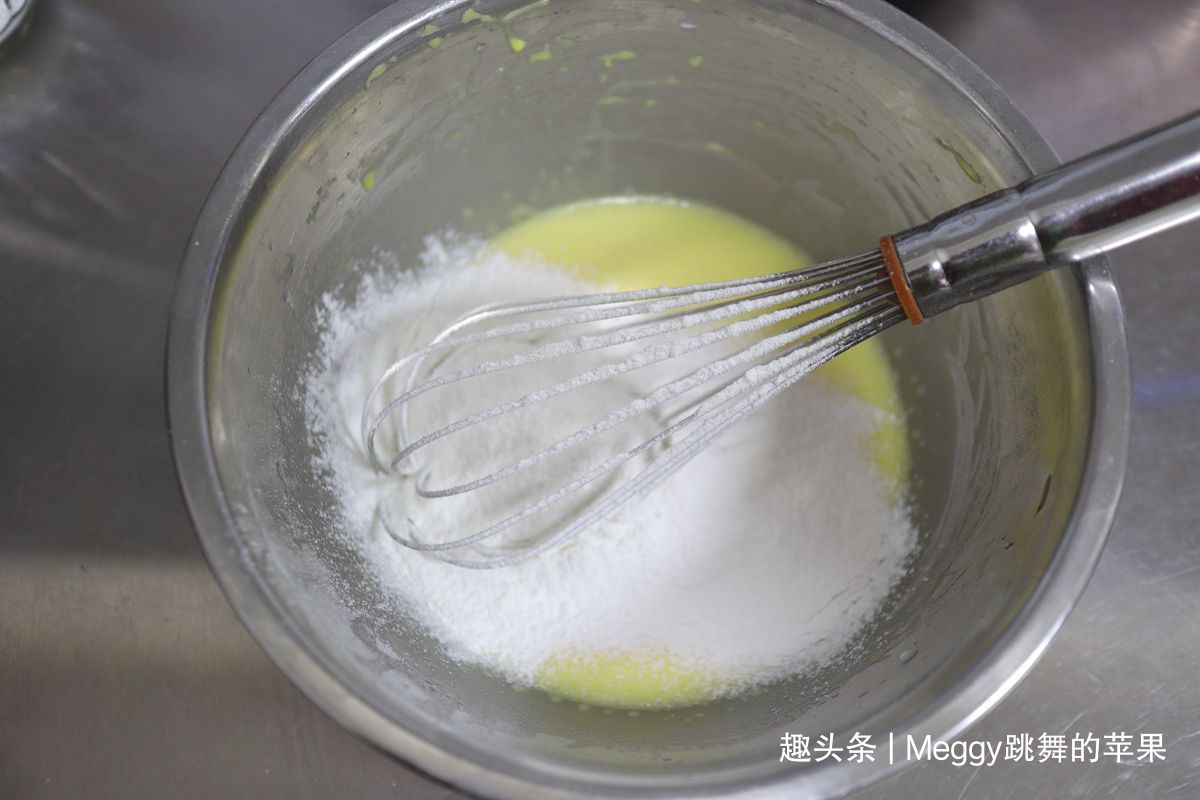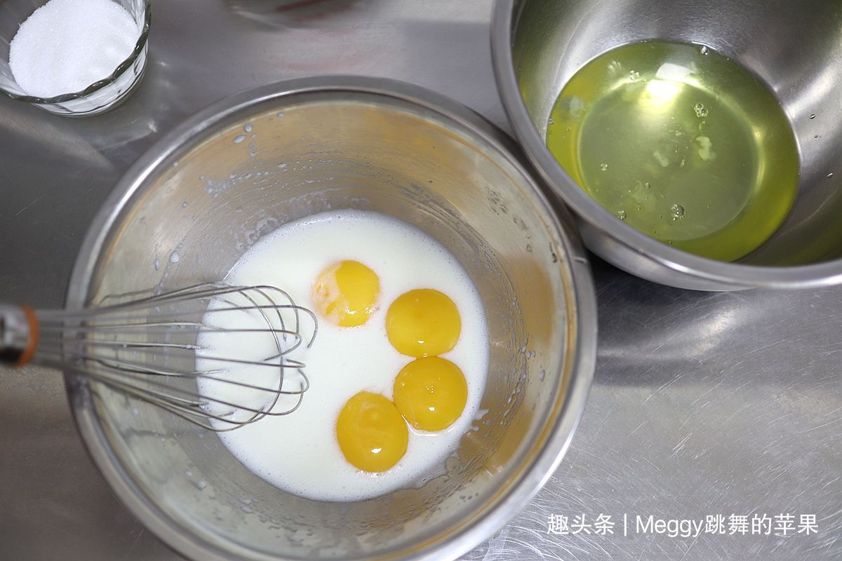 5. 蛋清蛋黄分离,蛋清入无油无水的打蛋盆中,蛋黄入牛奶玉米油溶液中;