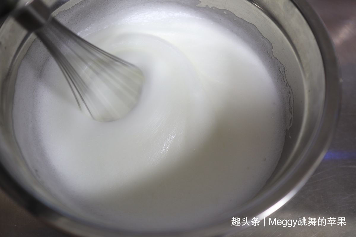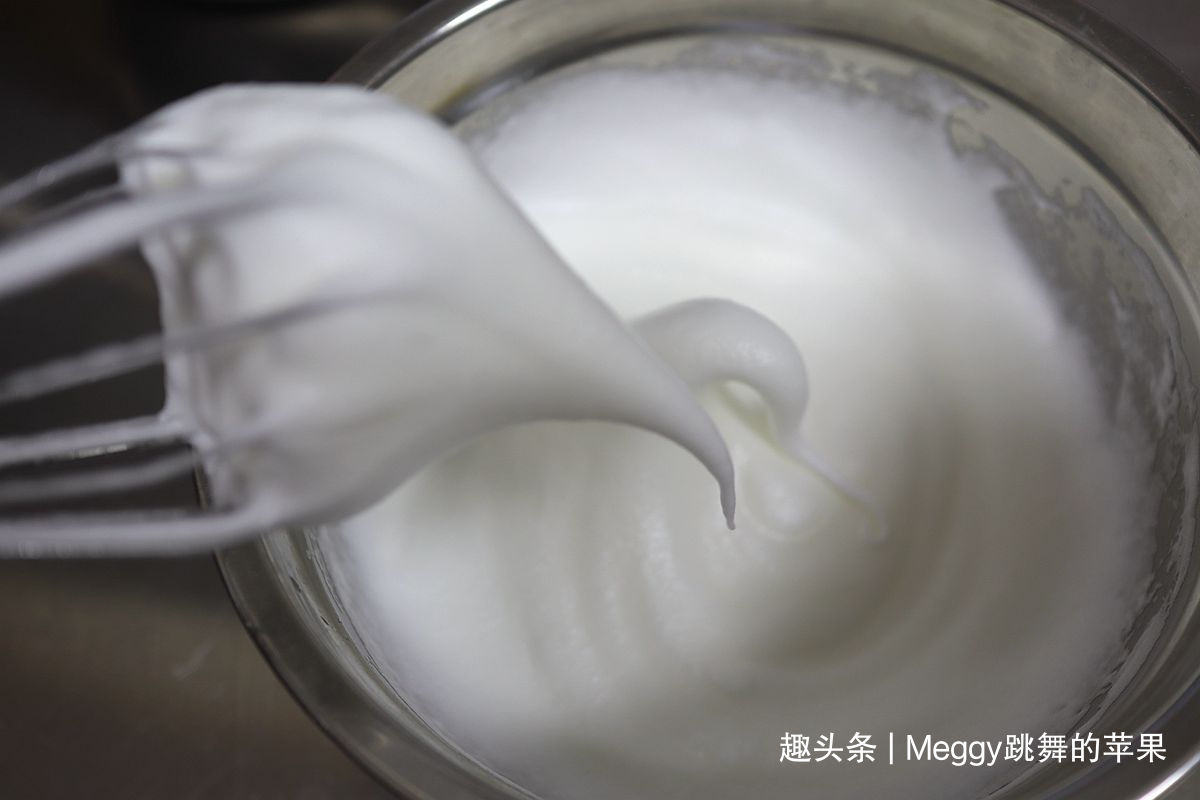 12. 蛋白糊出现光泽且打蛋器有阻力时,提起打蛋器,蛋白糊呈大弯钩;此时烤箱可开始预热160度;