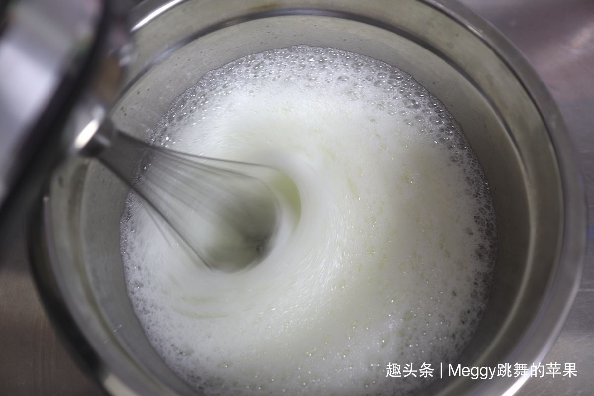9. 蛋清用电动打蛋器中速搅打出粗泡,放1/3细砂糖;