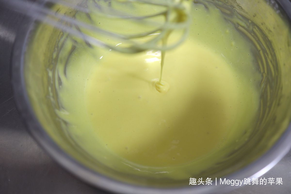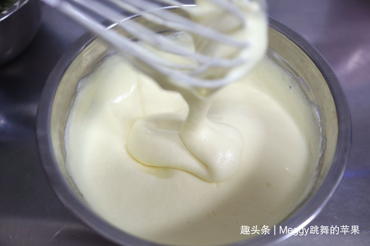 15. 用蛋抽从下向上混合均,提起打蛋器,蛋糊充斥在打蛋网中,缓慢地垂落下来;这就是蛋糕糊;