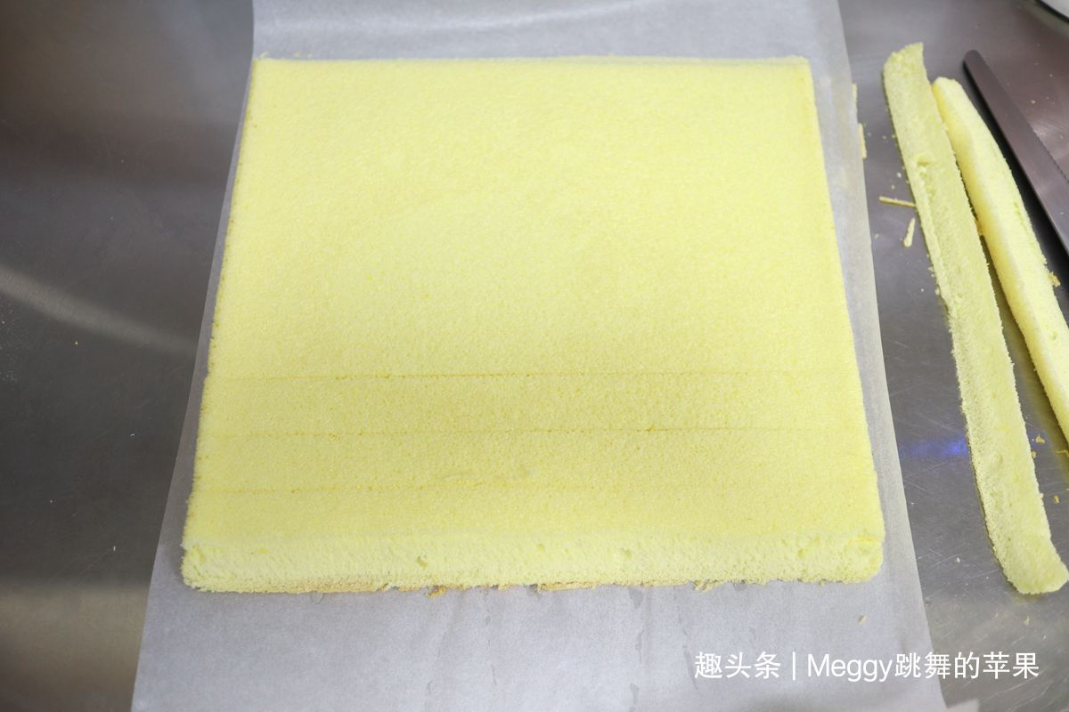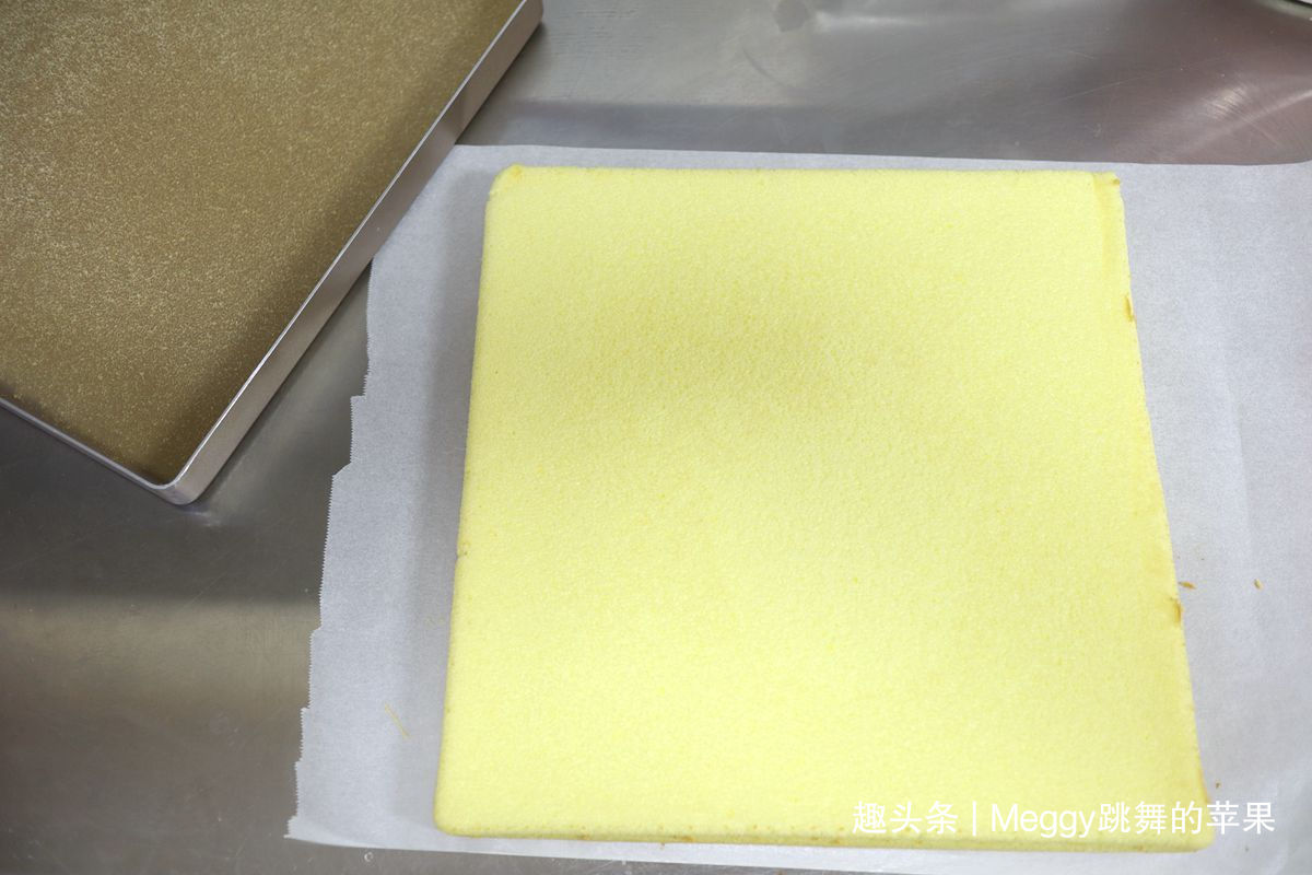20. 用脱模刀沿着烤盘划开四周,用刮板将一边轻轻挑起,烤盘倒扣,蛋糕片完整得出来的,完美毛巾面;晾2分钟,让过多的湿气挥发;