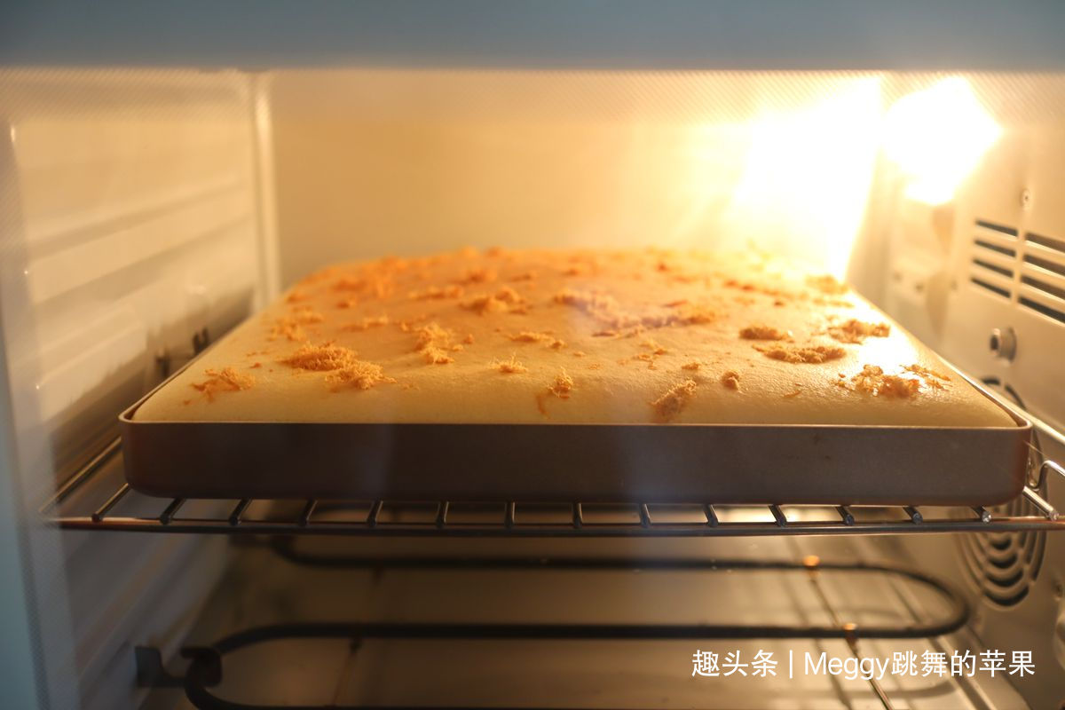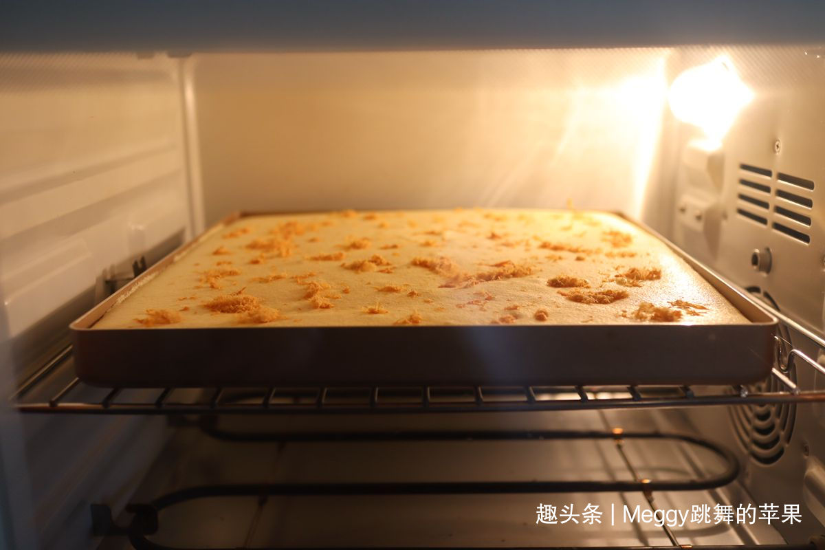 16. 将蛋糕糊从20公分高处倒入28*28cm烤盘里,端起烤盘,使蛋糕糊均匀地铺满烤盘,表面再撒适量肉松;不撒肉松就是原味蛋糕卷的光滑表面;