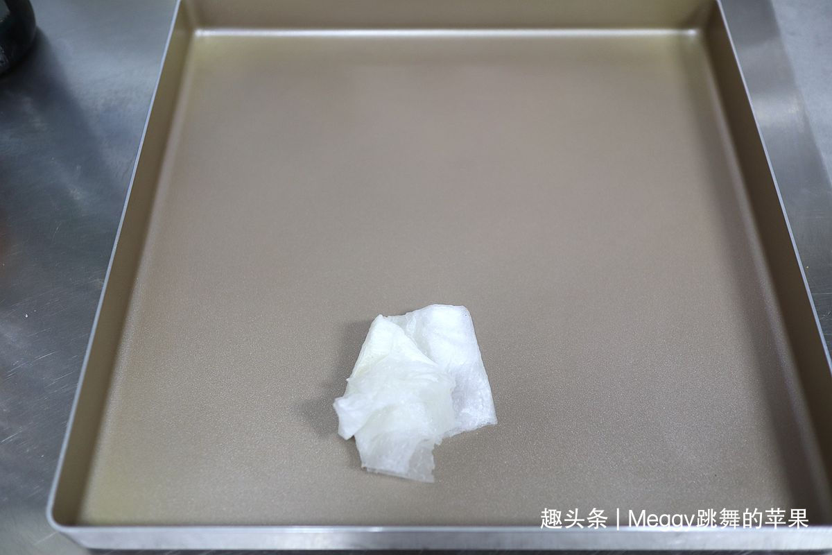 1. 不粘烤盘里抹少许油,用纸擦干净后会有少许油脂浸润在涂层里,无需铺油纸,蛋糕脱模有完美的毛巾,正卷反卷都漂亮;