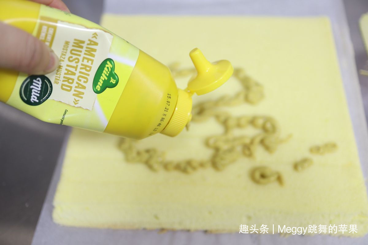 23. 将美式黄芥末酱挤在蛋糕片上;