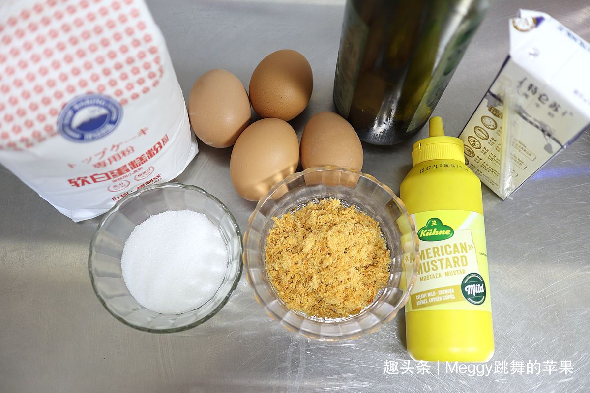 【材料】 鸡蛋4个,顶焙良品蛋糕粉50克,牛奶50克,玉米油40克,蛋白用细砂糖40克,美式黄芥末酱适量,肉松适量