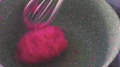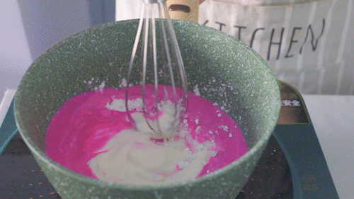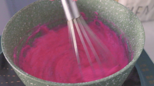 注意,不开火,用打蛋器搅拌均匀,直到没有淀粉颗粒。然后开小火煮,但是注意搅拌不能停。tips:慢慢加热的过程中,就可以看到火龙果牛奶糊开始慢慢变得粘稠。- 8 -