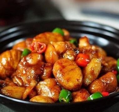 2、将鸡斩成块儿,焯水后用清水冲干净浮沫,将板栗拭干水分,略炸。