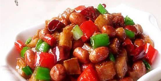 3、豆腐干炒干水份后加入煮好的花生一起煸炒。