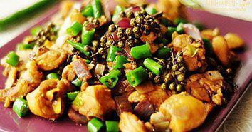 6、倒入线椒翻炒,倒入滑过油的鸡丁,倒入15毫升蚝油翻炒