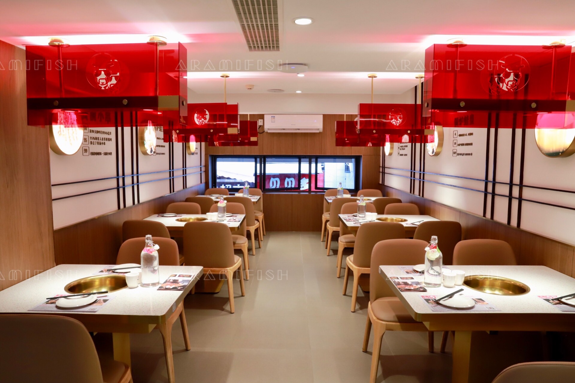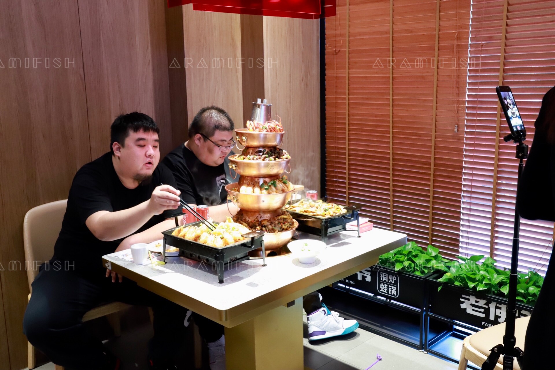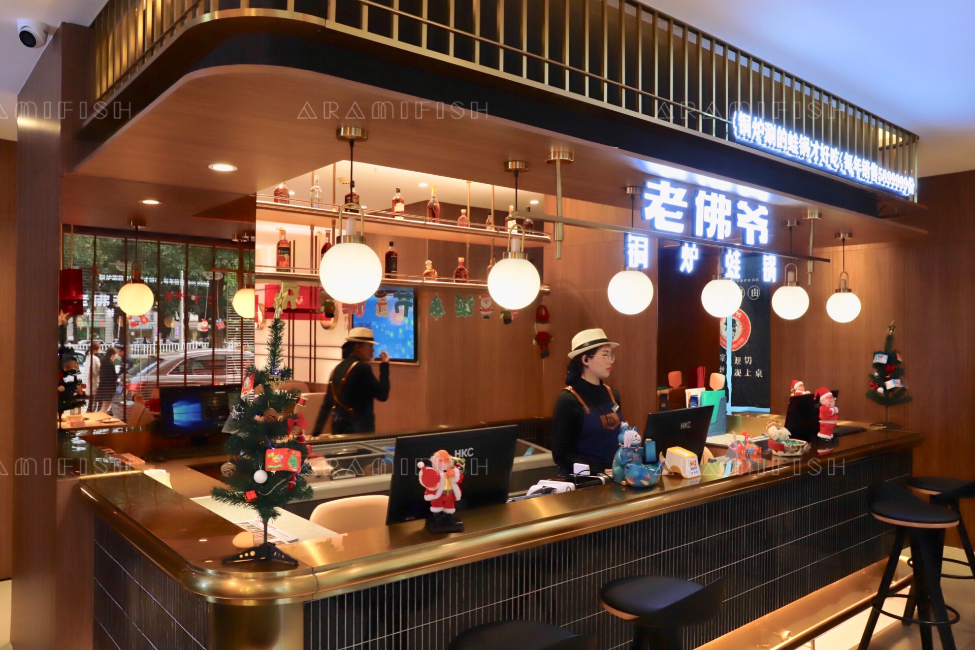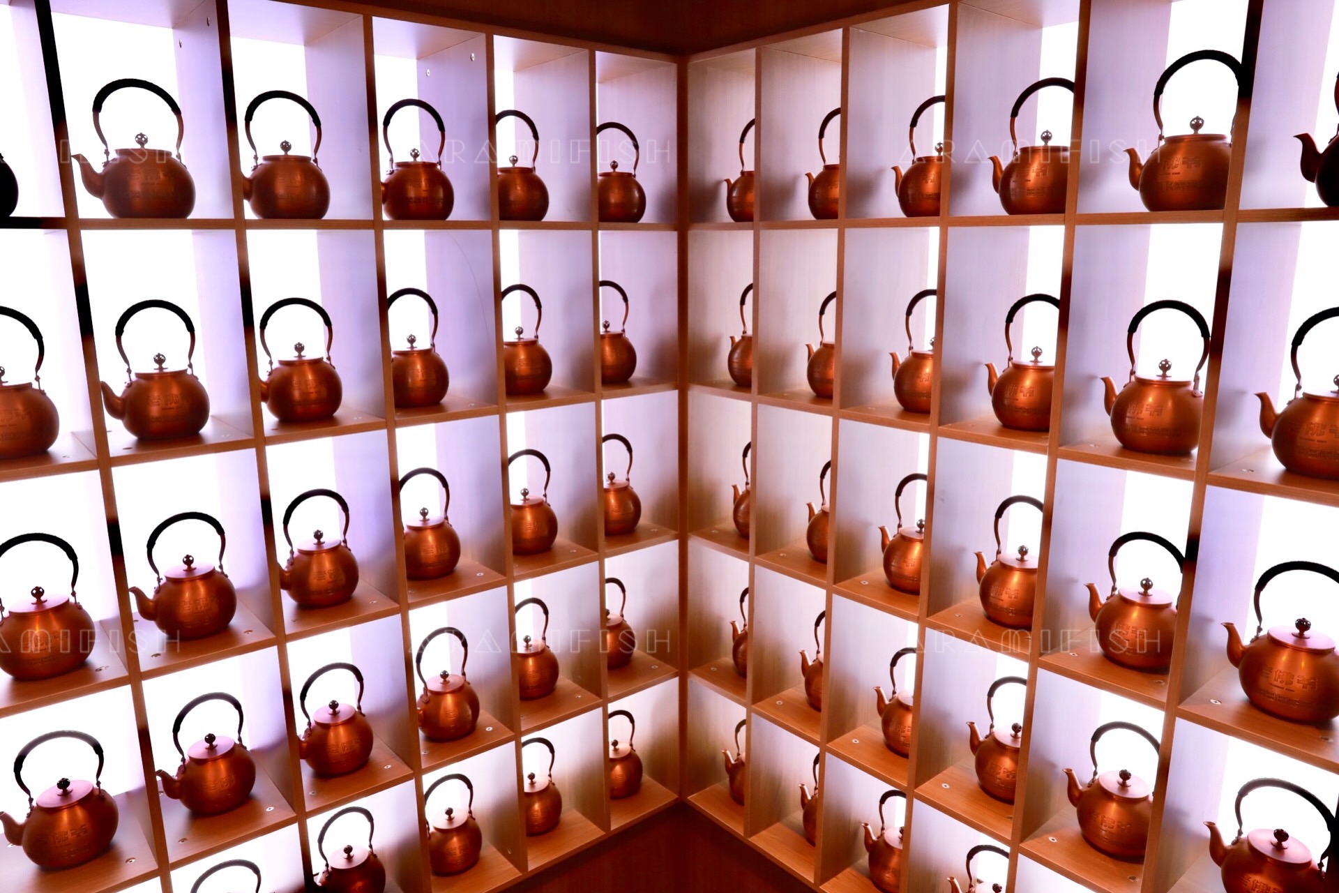 我们今天来到的是明发店,就在莲坂北公车站的正后方,交通非常便利,一下车就可以看到红色的招牌特别显眼。店里的装修简洁明快,一二楼楼道一整面的铜壶墙尤为壮观。