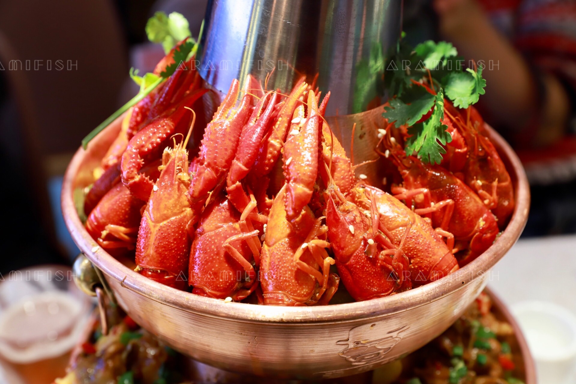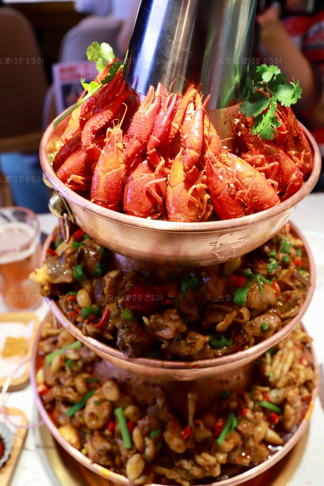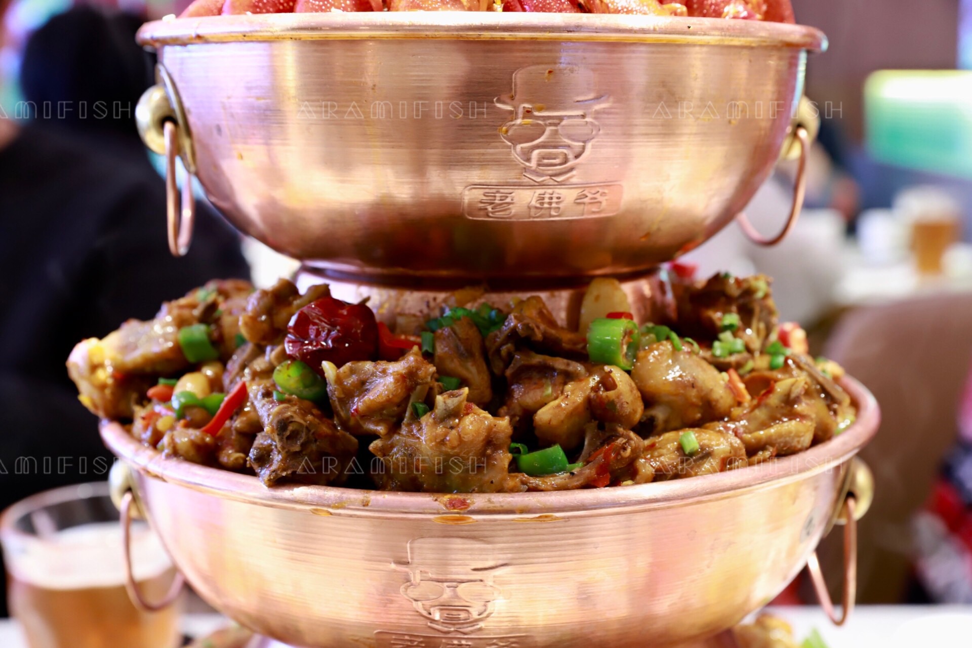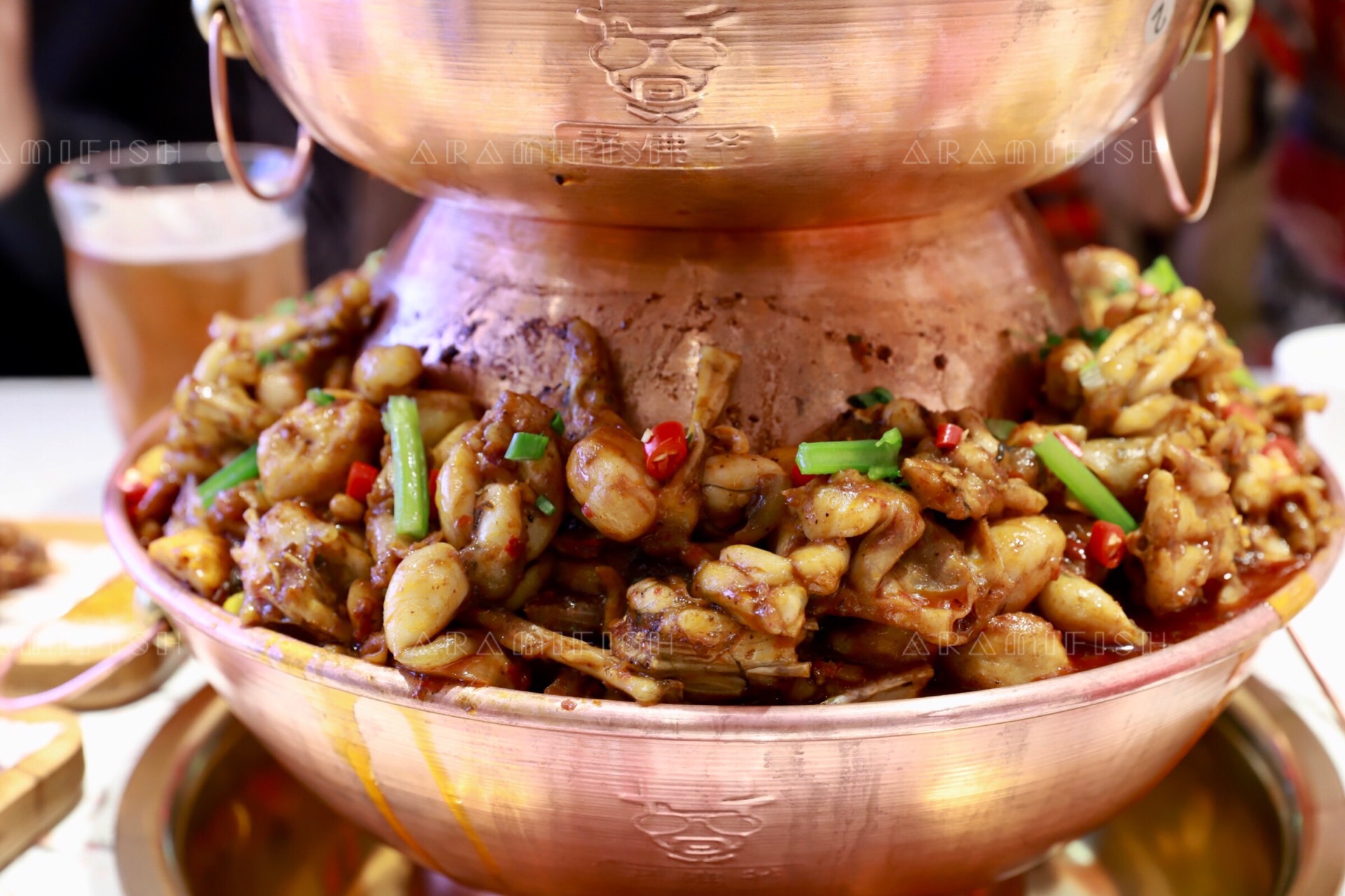 老佛爷选用的锅具是老北京炭火铜锅,有一层、二层、三层、四层可选,除了牛蛙之外,还可以选择鲜虾、小龙虾、鸡肉、牛肉、排骨等食材,随心搭配。这种锅在温度的控制上性能更好,随着炭火的加热,汤汁的浓香会完全都渗进食材里,越煮越香。而且就算吃得再久,也不会凉掉,一直都是一锅热乎乎沸腾的牛蛙。老佛爷的食材也都是很讲究的,厨师们均选养足180天、4-6两的福建鲜蛙,活蛙现做。一整锅蛙蛙,个个都是肤白肉嫩大长腿,看着就让人垂涎三尺。