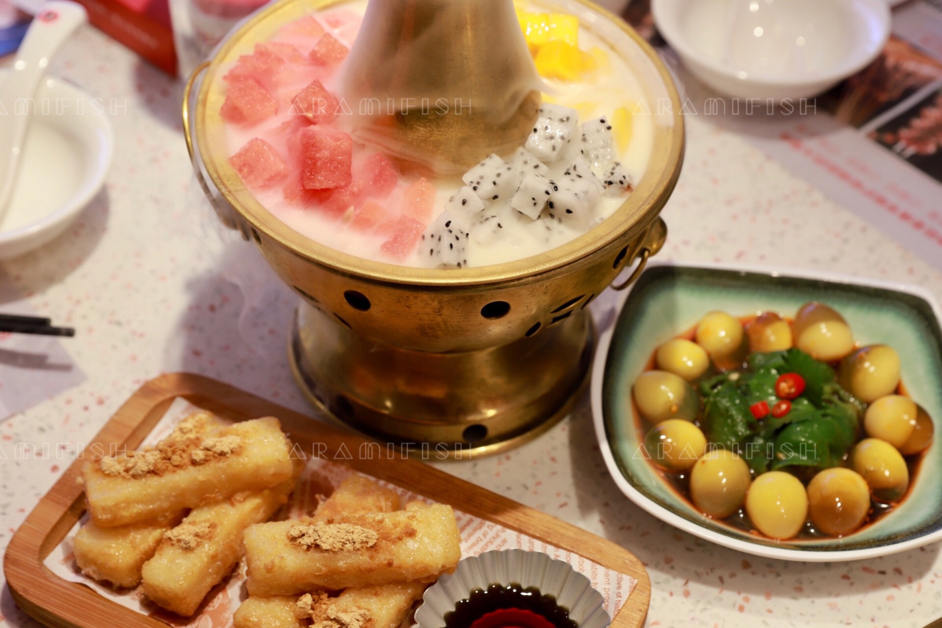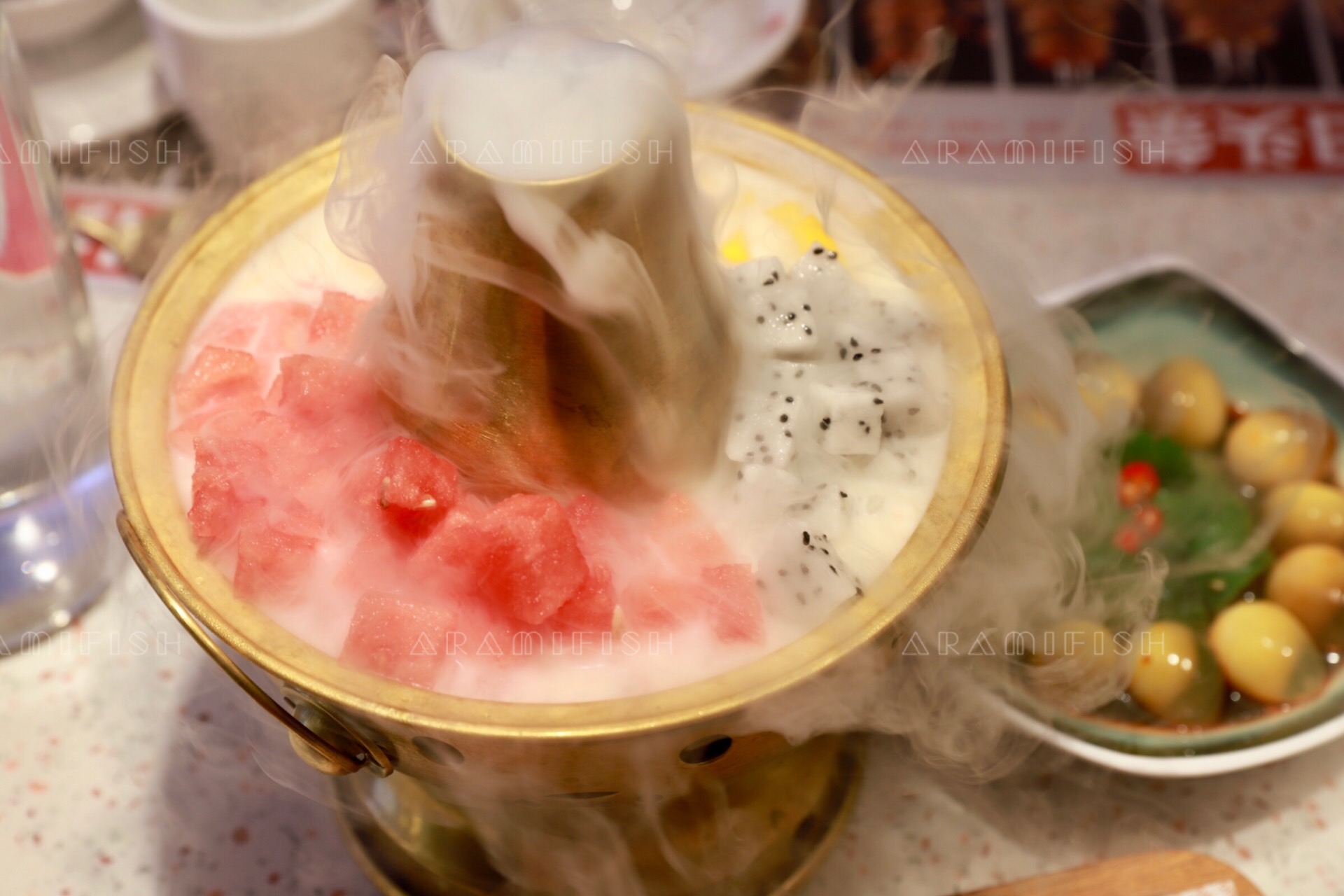 除了招牌炭火蛙锅之外,老佛爷也有许多其他好吃的小食。例如一上桌就云雾缭绕的特色锅底捞,仪式感十足,有西瓜、芒果、火龙果三种水果,浸没在香浓的牛奶里,清凉冰爽,搭配蛙锅特别解腻。